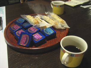 | 今夜も小林道夫先生が差し入れてくださったお菓子がうれしいです。そしてコーヒーもとってもおいしいです。 | ![]() |