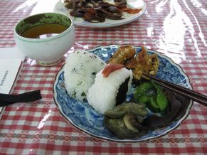 | 大急ぎで、夕食を頂きました。おにぎりがとってもおいしいです。音楽祭は料理スタッフの作ってくださる食事も楽しみの一つです。 | ![]() |
