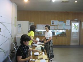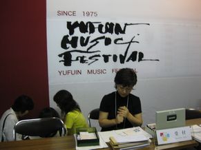 | 由布院音楽祭の受付です。今夜は清水みっちゃんが座っています。 | ![]() |