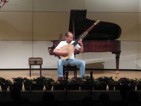 珍しい楽器アーチリュートを演奏される高本一郎さん |