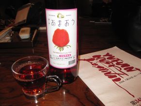 | ロビーの整理をして、私たちはかなかな亭に引き揚げました。熊本で、友人がプレゼントしてくれた「あまおうワイン」を飲みました。あまおう苺から作ったワイン、香りが良くて、甘いワインでした。 今日は熊本の山の上から、由布院盆地へと忙しかったですが、美しい音楽と赤いワインに癒されました。 |