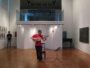 |  | 特別ゲストの高本一郎さんがスタンバイです。下に置かれている楽器はバロックギターです。 |