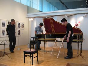 | 演奏終了後、ただちに、夜のステージの準備が始まりました。ステージ台が並び、その上にチェンバロが運び込まれました。早速、調律に取り掛かるチェンバロ製作者の中村荘一さんです。(1990年作フレンチモデル) |  |