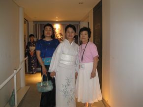 |  | 私の友人たちも来てくれました。久美子さんは夏らしいブルーの装い、かおるさんは今日、初おろしの涼やかな和服姿です。水際の白サギが描かれています。三人で記念写真。 |